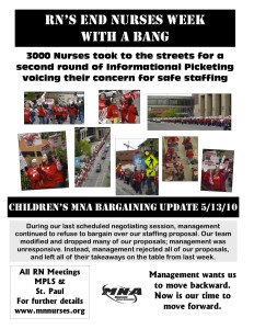 We started Nurses’ Week on May 6 in a tremendous fashion. Thousand of nurses came out to an historic informational picket to send a clear message to management that RNs are willing to do what it takes to stand up for patients.