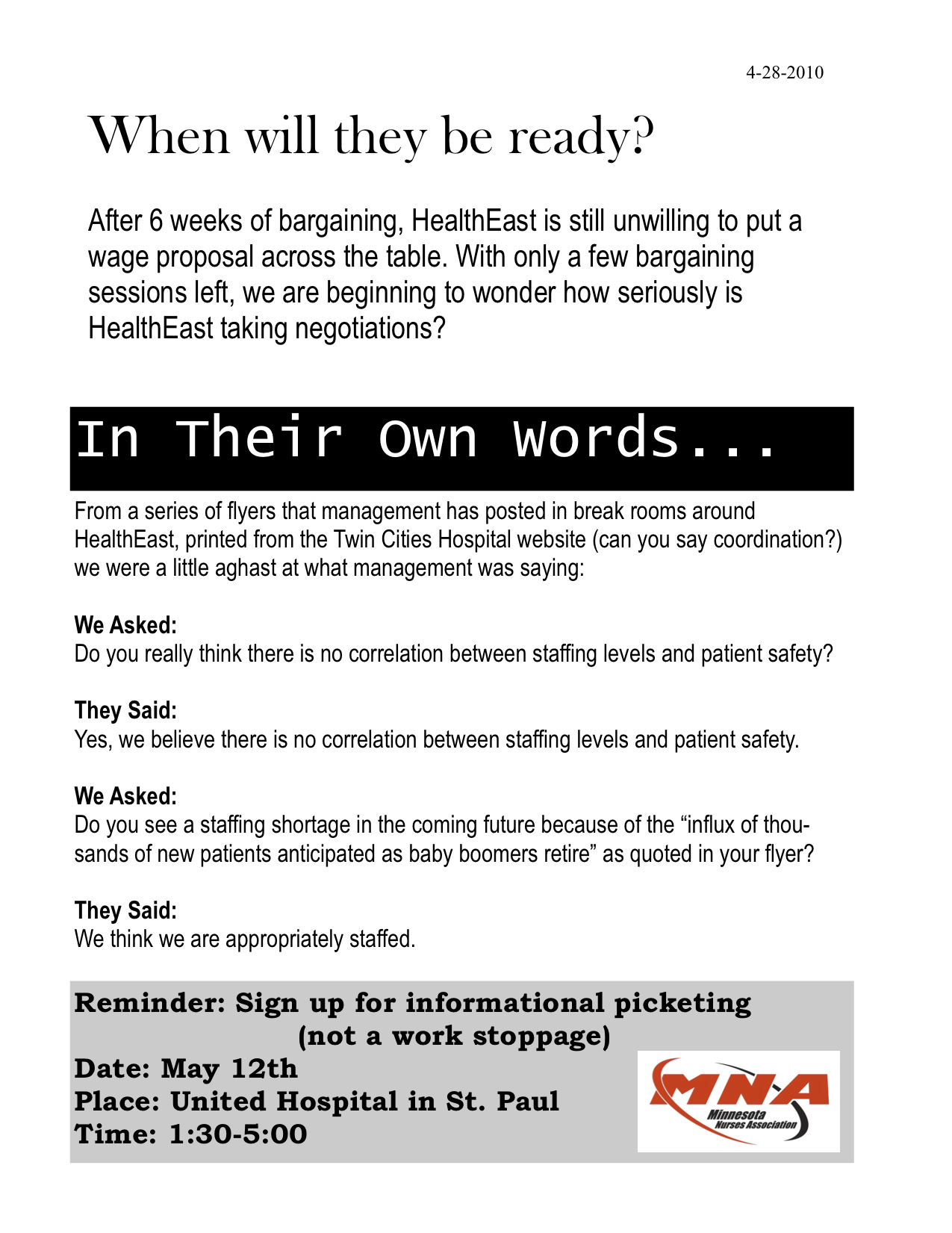 Bargaining, Hospitals, Labor Unions Methodist April 22 Bargaining Update (Flyer) April 22, 2010 by mnnurses
