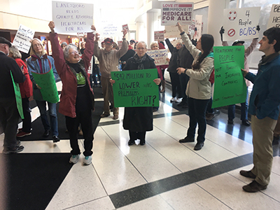 The group then went to Blue Cross/Blue Shield headquarters with a letter asking for Blue Cross CEO Michael Guyette to publicly commit to lowering premiums and selling individual insurance products statewide.